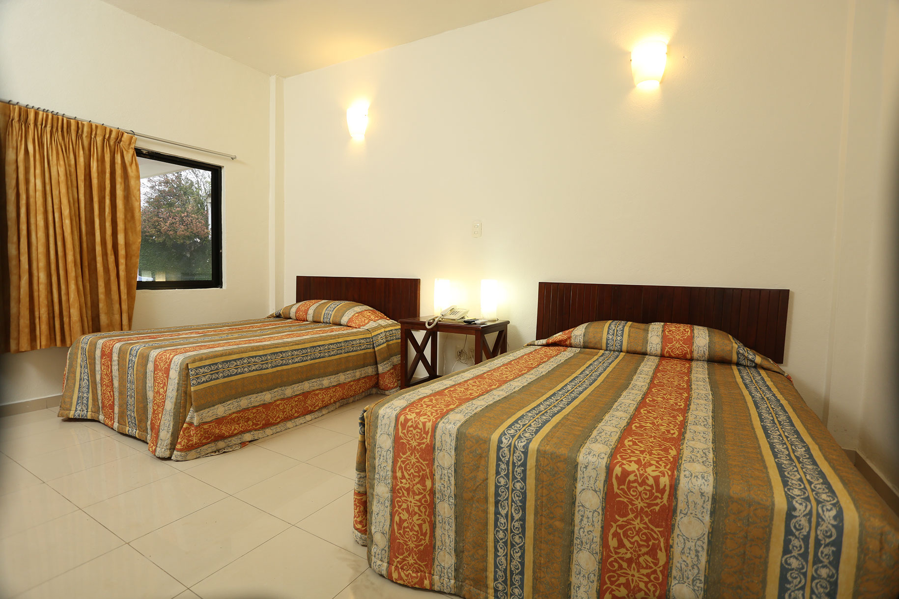 2 camas matrimoniales, aire acondicionado, escritorio con silla, buró, pantalla led 32 pulgadas, teléfono, caja de seguridad, sistema de cable,baño completo, agua caliente, servicio a la habitación de 8:00 am a 10:00 pm, internet sin costo.